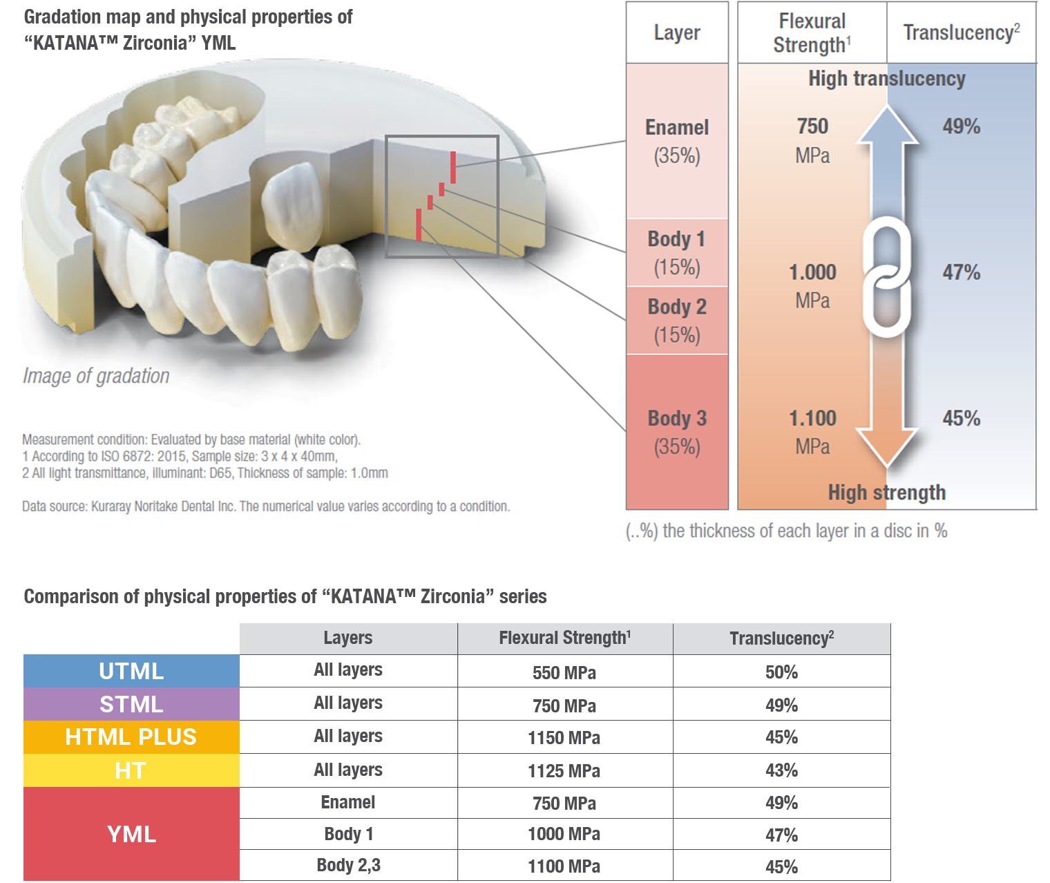 Các vật liệu nhiều lớp “KATANA™ Zirconia” hiện có ( “KATANA™ Zirconia” UTML/ STML/HTML PLUS) có sự phân cấp màu sắc, trong khi vật liệu nền của từng loại tương ứng là giống nhau đối với tất cả các lớp. Độ bền và độ trong mờ là giống nhau đối với tất cả các lớp của từng loại tương ứng.